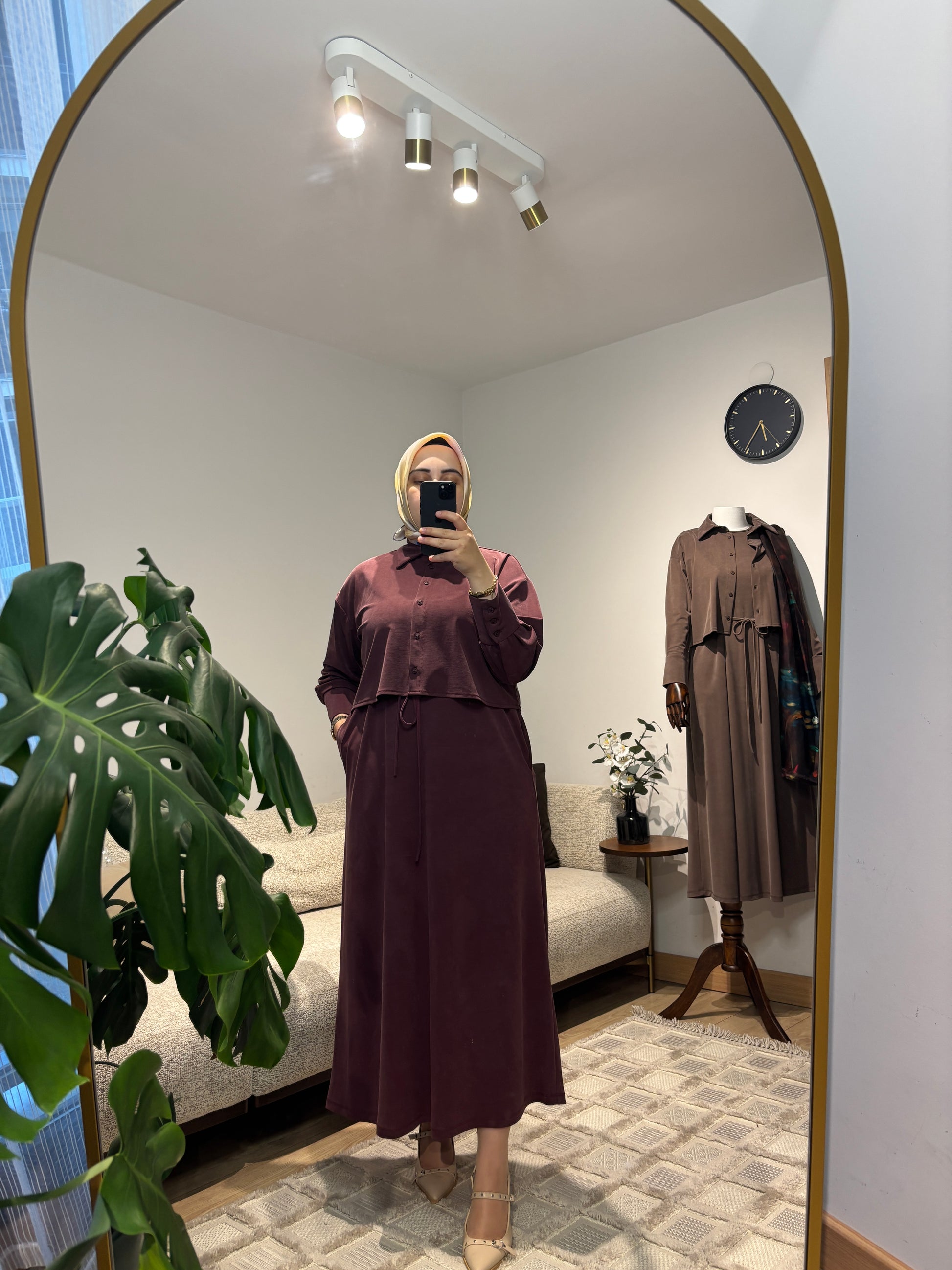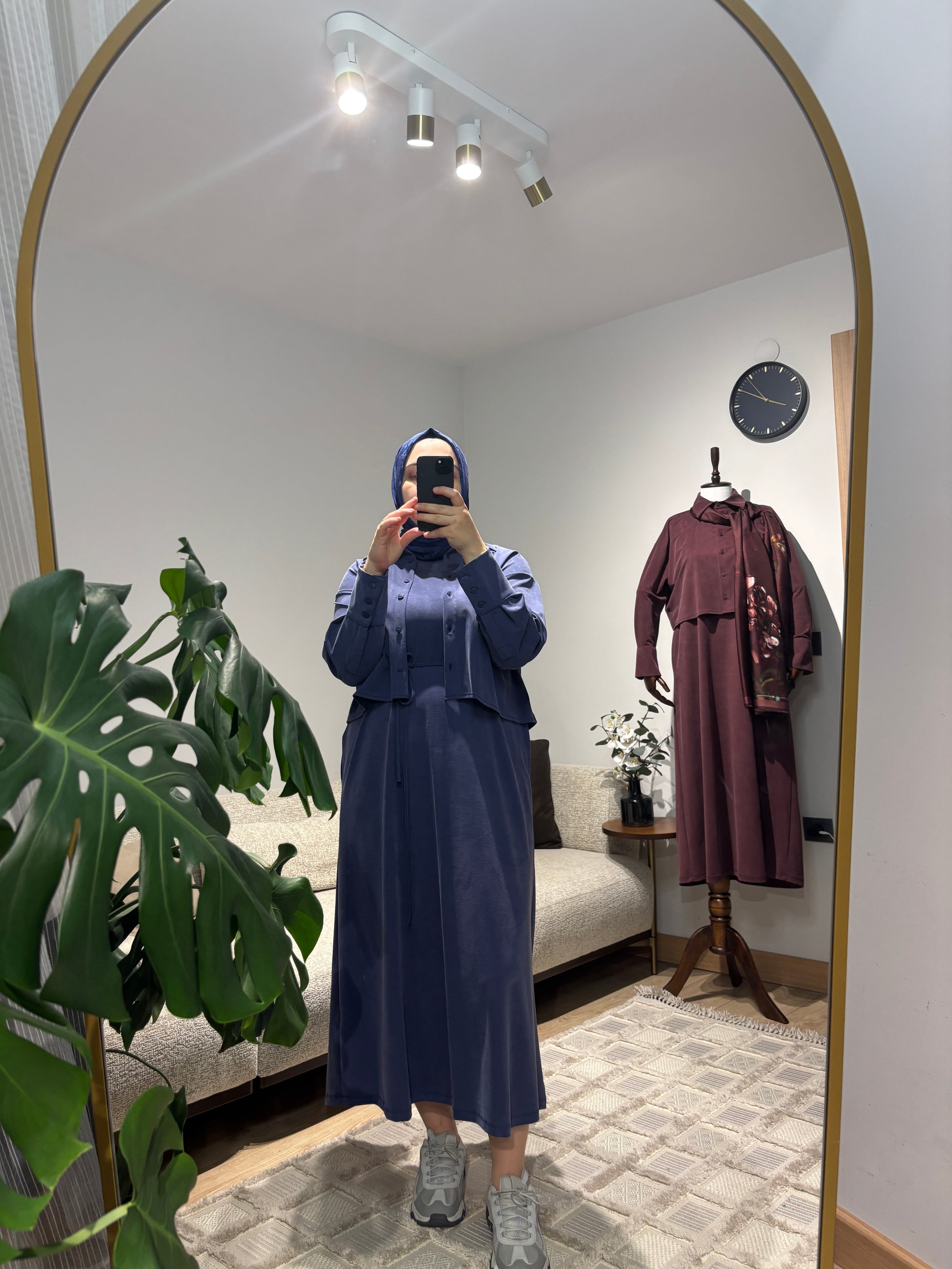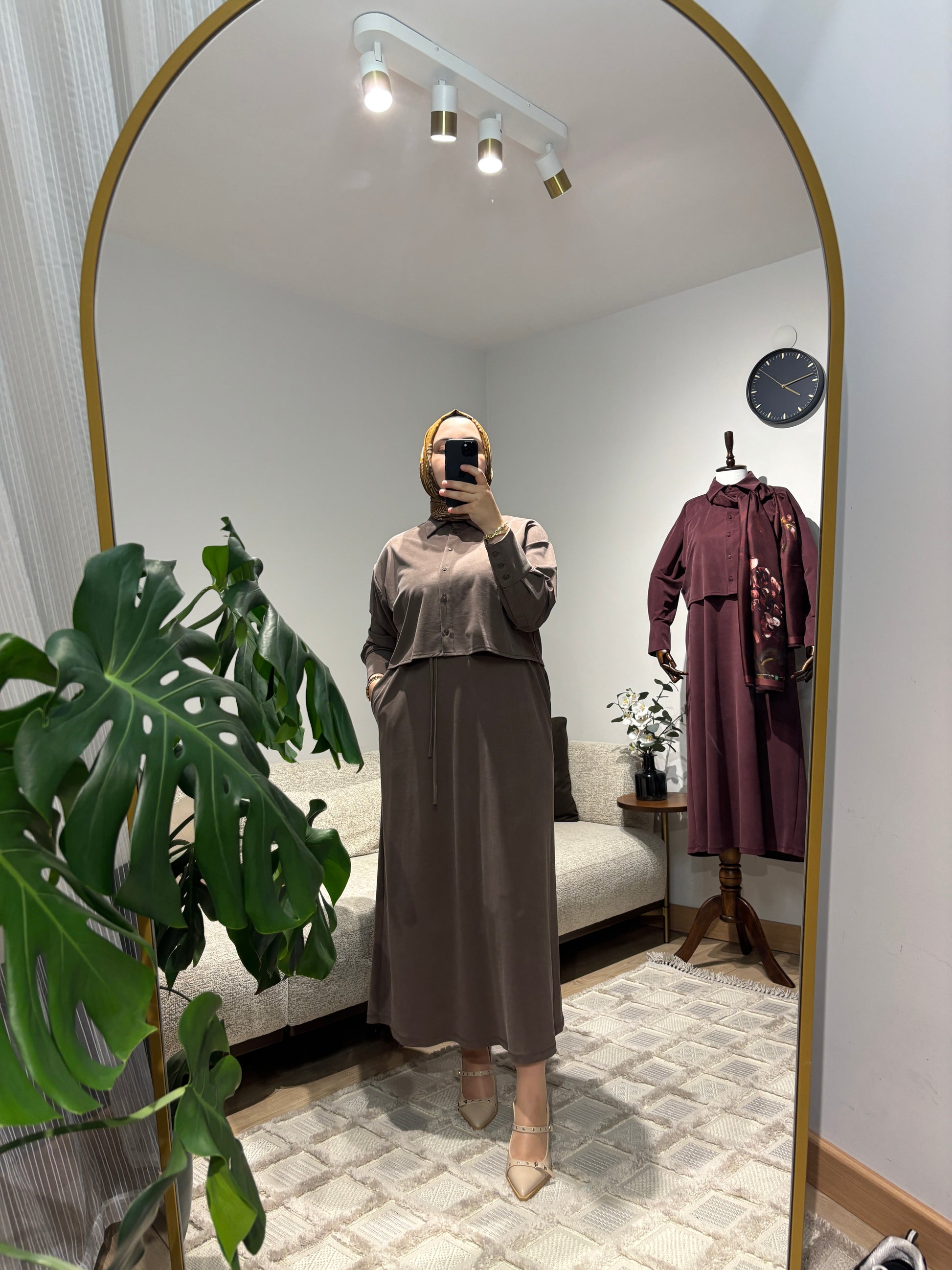 Gömlek tasarımından ilham alan bu elbise, modern çizgisi ve konforlu yapısıyla şıklığı günlük hayata taşır. Rahat kalıbı sayesinde gün boyu konfor sağlarken, ofis ve şehir kombinlerinde zamansız bir stil sunar.