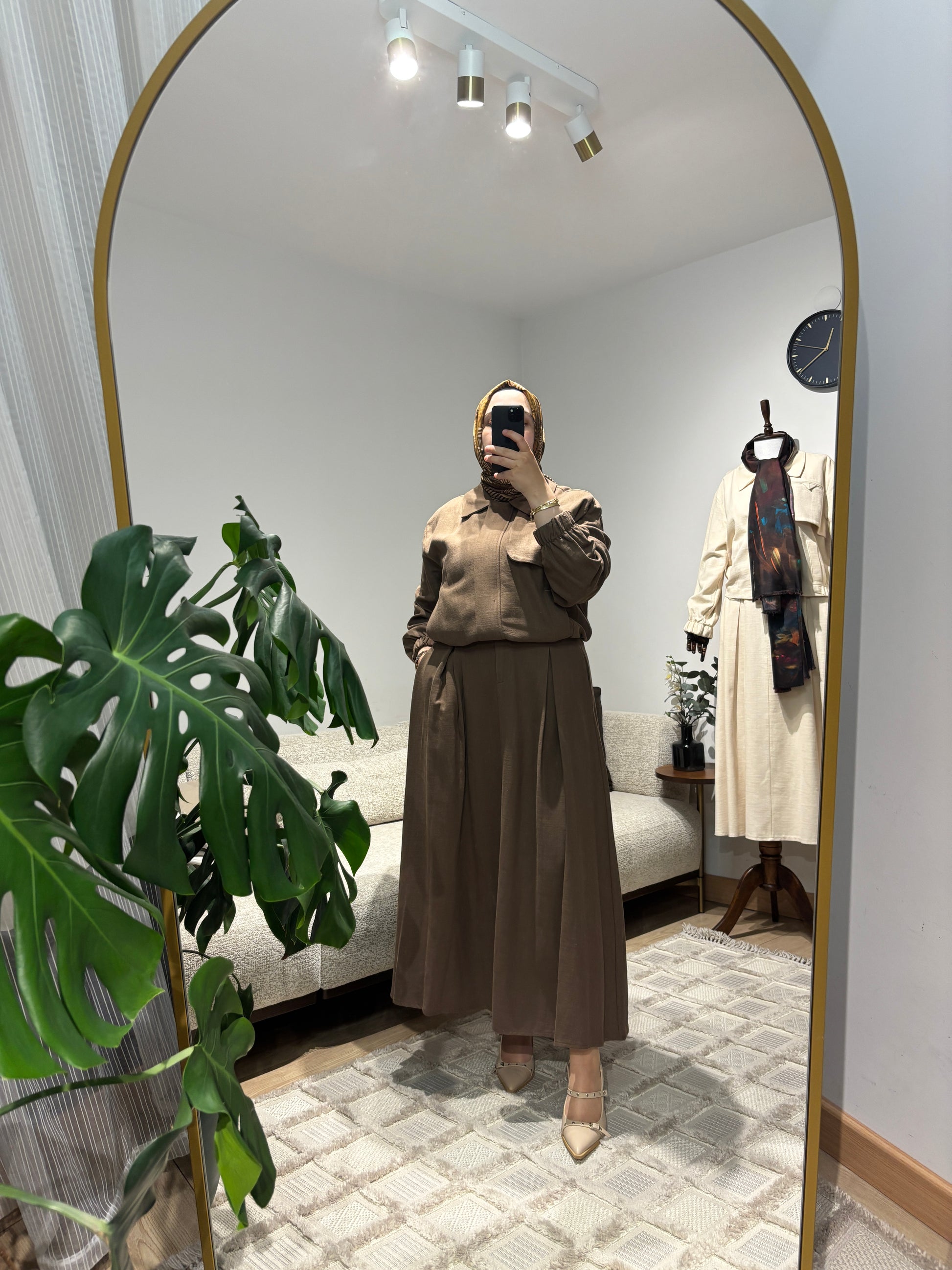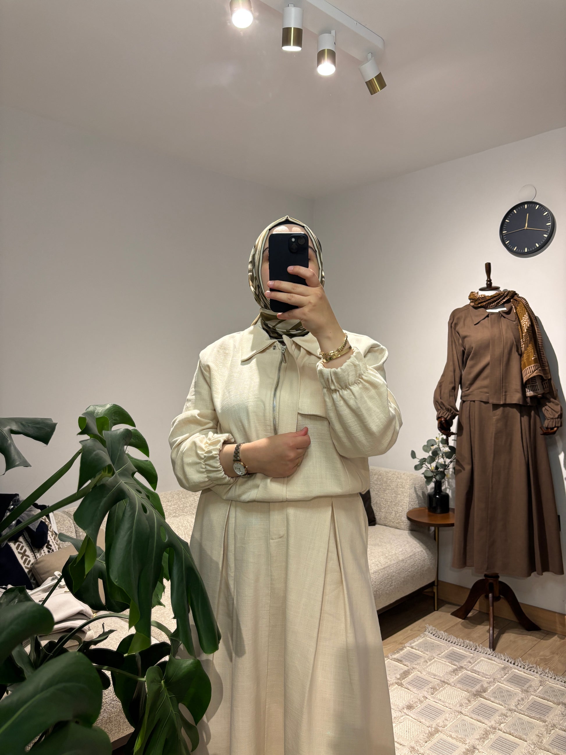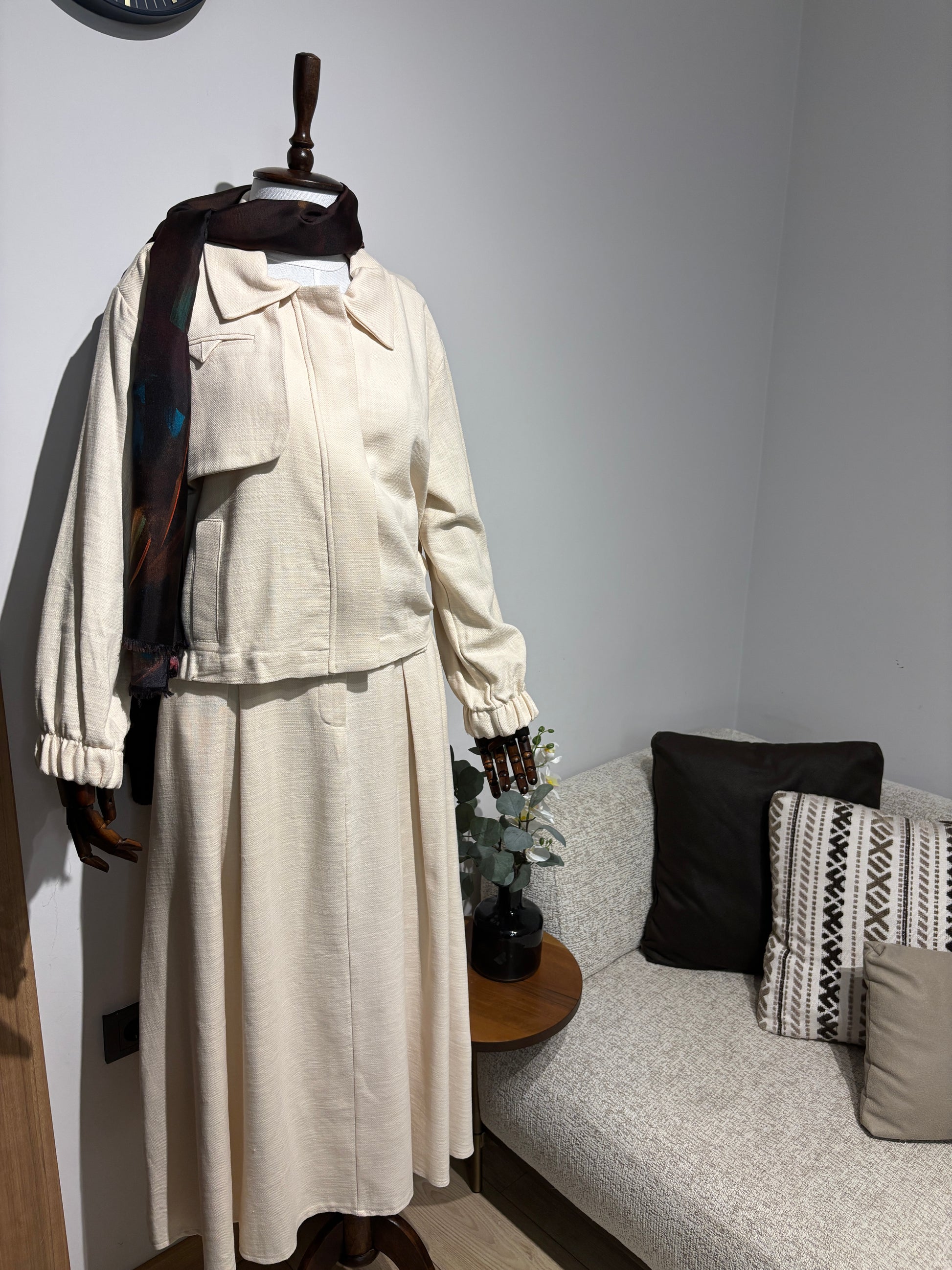 Sade ve şık detaylarıyla öne çıkan bu takım, gizli patlı fermuarıyla modern bir görünüm sunuyor. Akıcı kumaşıyla gün boyu konfor sağlarken, zarif etek kesimi feminen bir duruş kazandırıyor. İşten özel davetlere kadar her ortamda kullanabileceğiniz bu modeli keşfedin!