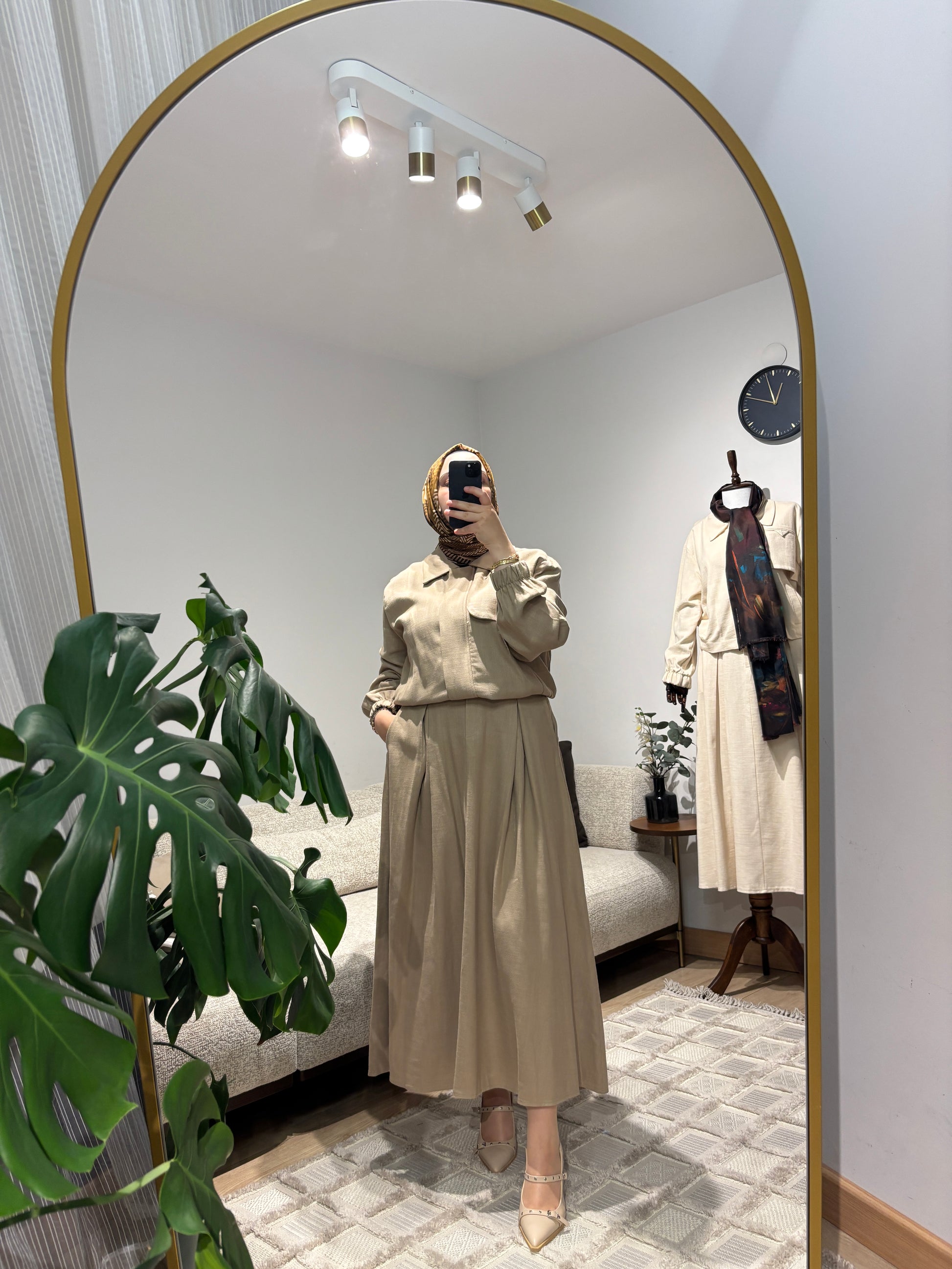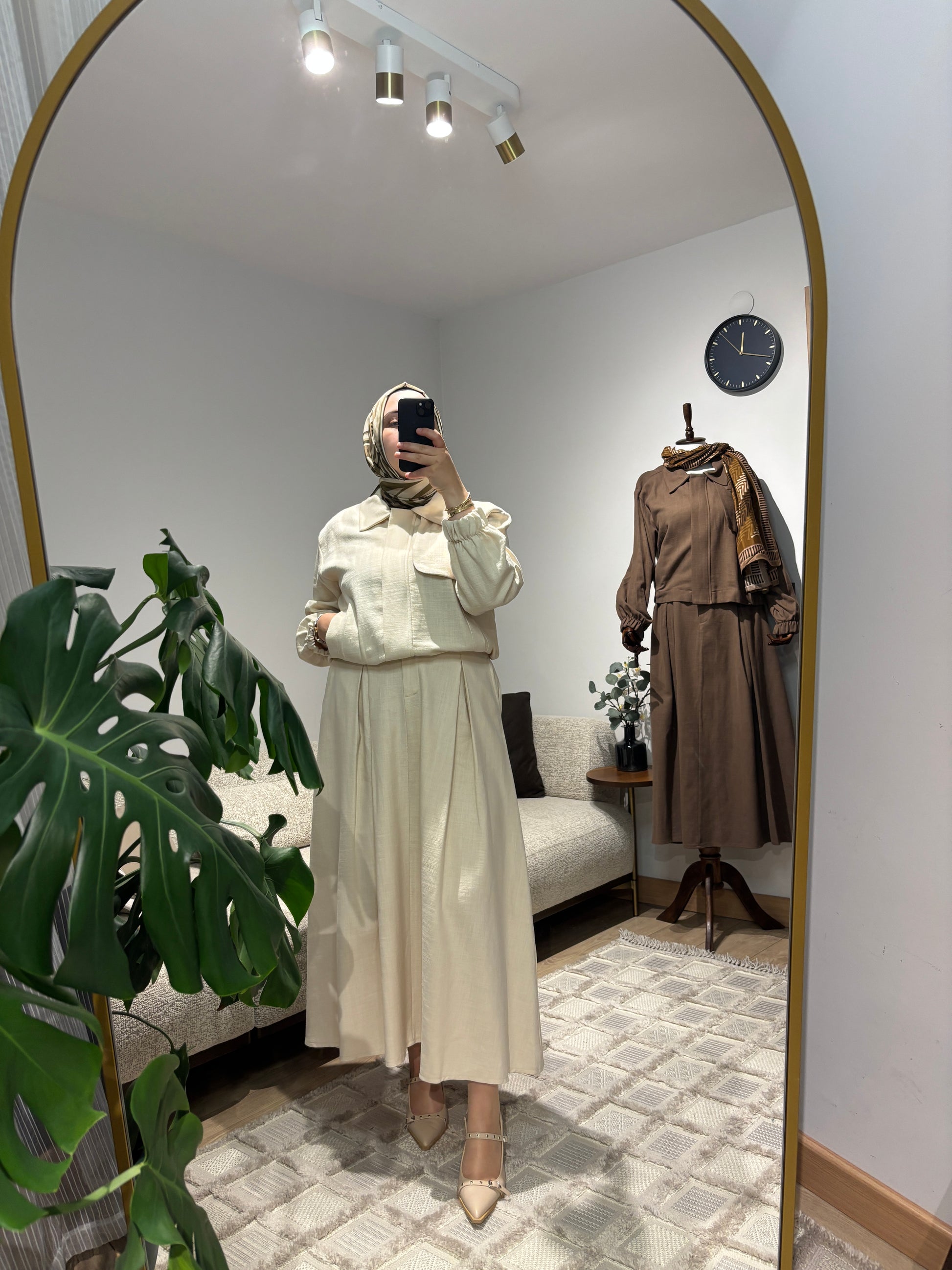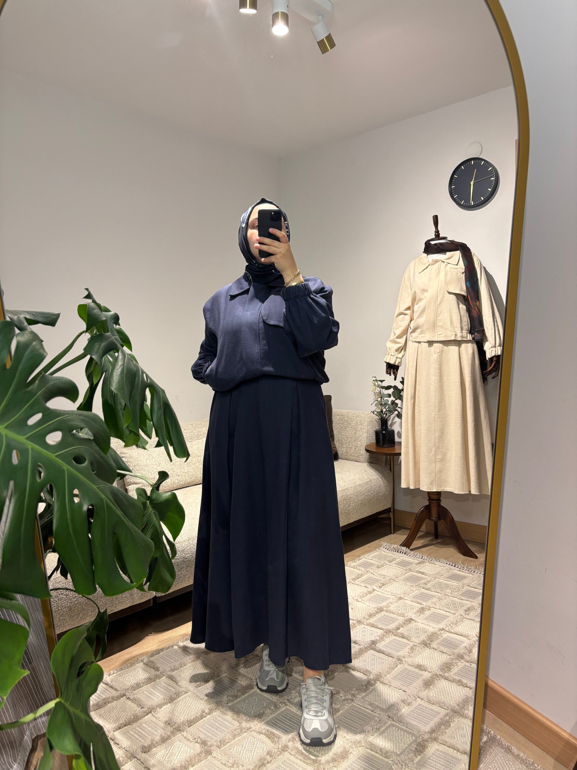 Sade ve şık detaylarıyla öne çıkan bu takım, gizli patlı fermuarıyla modern bir görünüm sunuyor. Akıcı kumaşıyla gün boyu konfor sağlarken, zarif etek kesimi feminen bir duruş kazandırıyor. İşten özel davetlere kadar her ortamda kullanabileceğiniz bu modeli keşfedin!